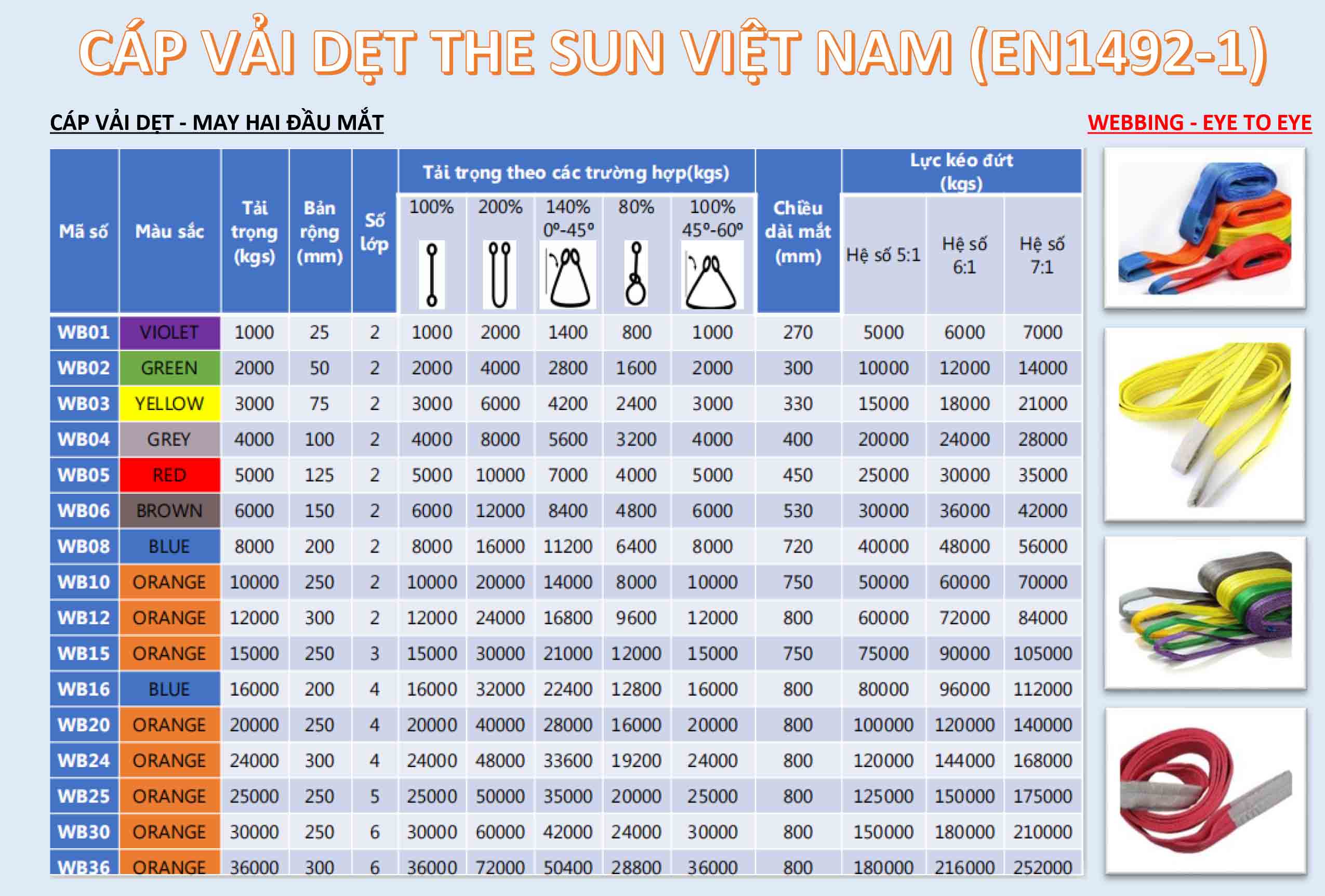 – Chọn đúng dây cáp vải với tải trọng phù hợp, quý khách hàng nên chú ý góc nâng cũng ảnh hưởng đến tải trọng của dây cáp.