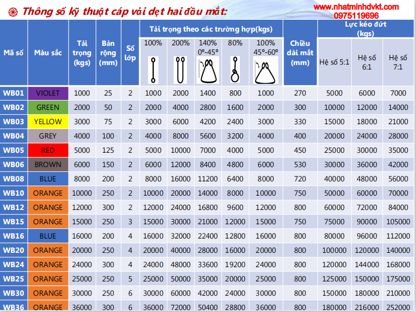 – Chọn đúng dây cáp vải với tải trọng phù hợp, quý khách hàng nên chú ý góc nâng cũng ảnh hưởng đến tải trọng của dây cáp.