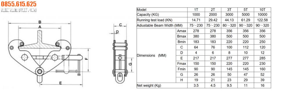 Thông số kỹ thuật của kẹp dầm chữ Y 1 tấn Kawasaki