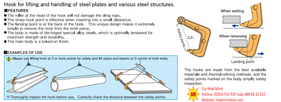 Móc ống – móc tôn tấm Supertool/ Nhật Bản được làm bằng thép đúc 100% bền bỉ với thời gian. Móc kép đôi nên dễ dàng móc được thép hình và giữ thăng bằng tốt hơn các loại móc khác trên thị trường – Có tải trọng từ 0.5 tấn – 5 tấn: